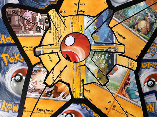 These pieces have been carefully cut out from non-holographic Pokémon cards and placed onto backgrounds formed by an arrangement of card-backs.