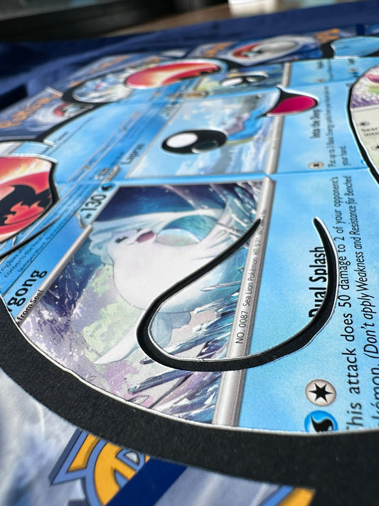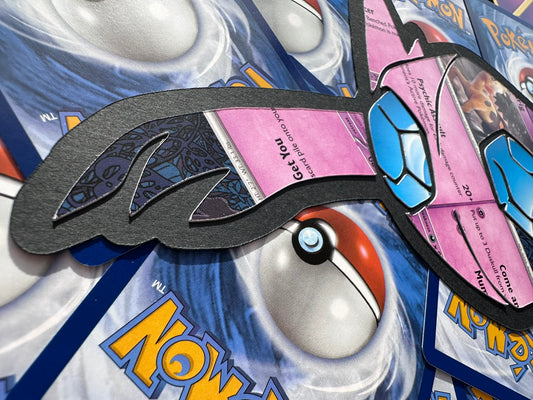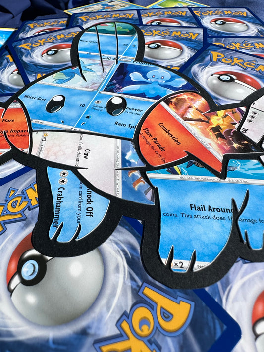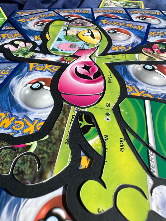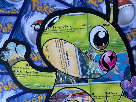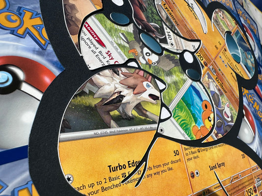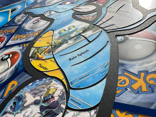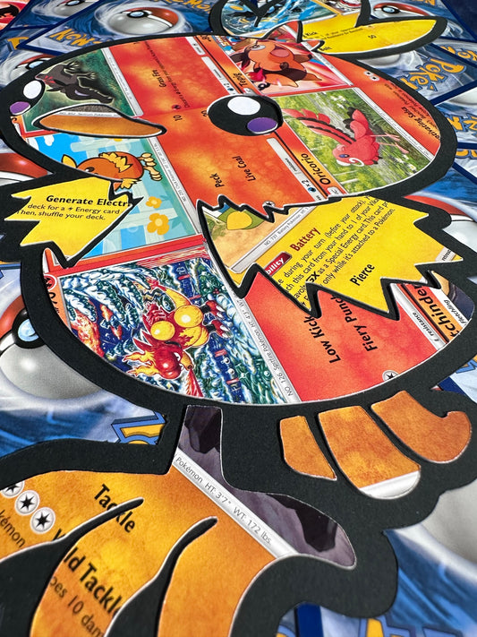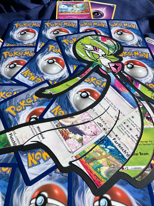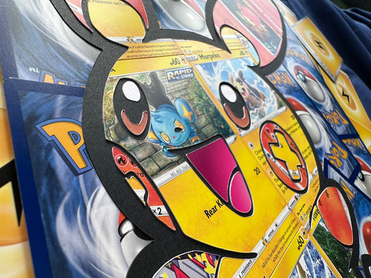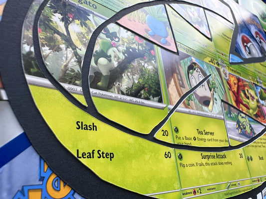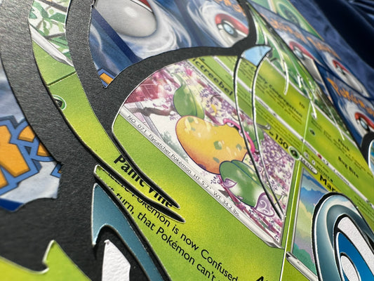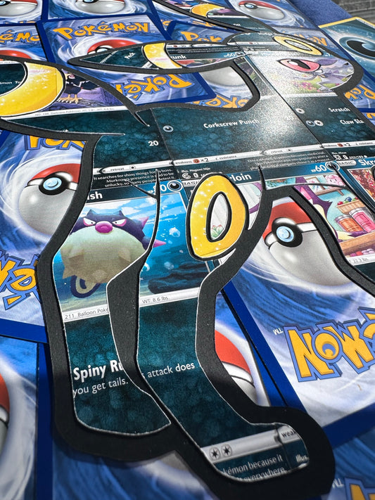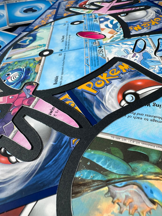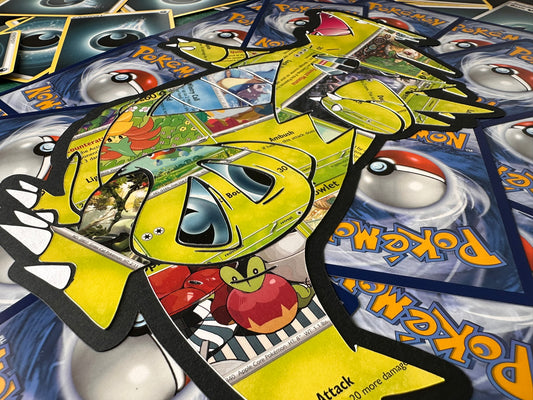 These pieces have been carefully cut out from non-holographic Pokémon cards and placed onto backgrounds formed by an arrangement of card-backs.