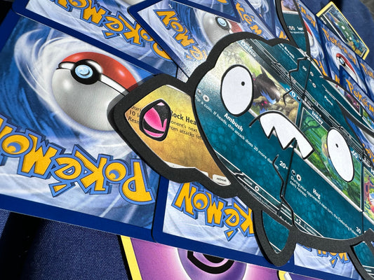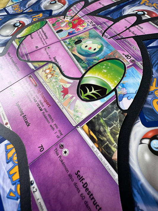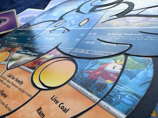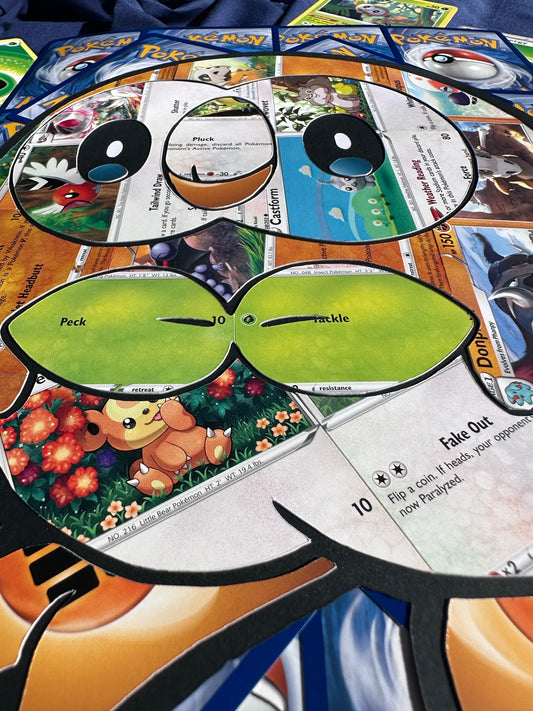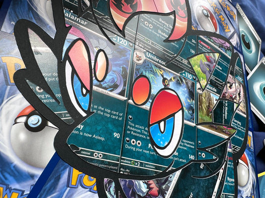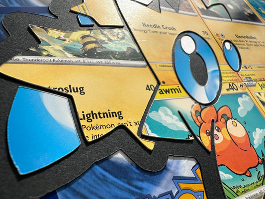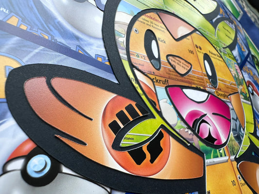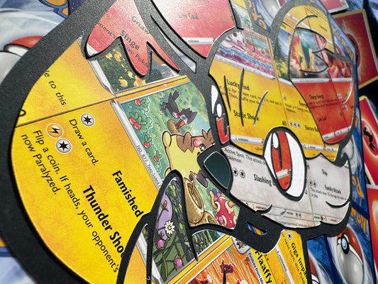 These Pokemon have been carefully cut out from Pokémon cards and placed into backgrounds formed by an arrangement of the card-backs and black paper.
