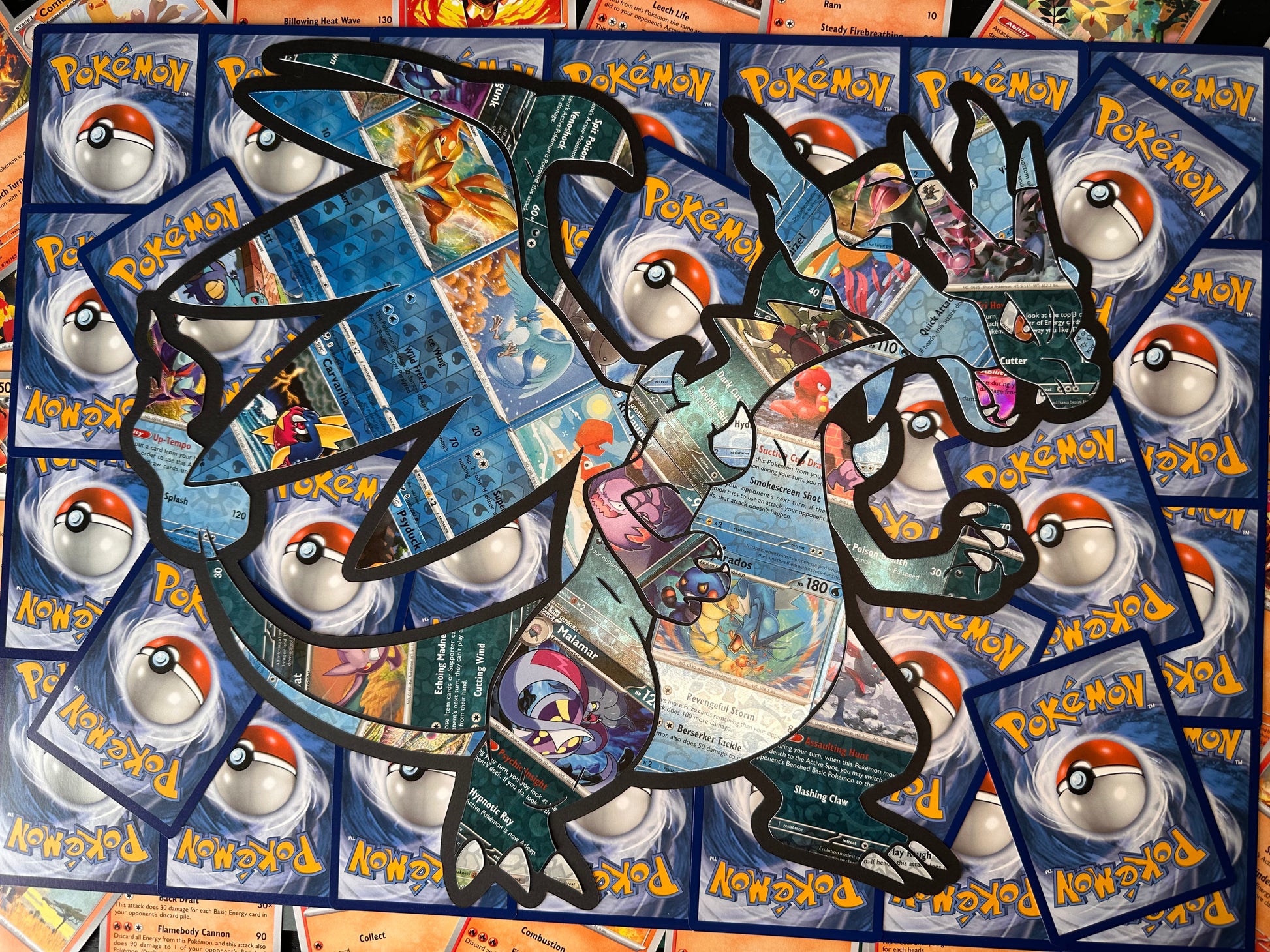 MEGA CHARIZARD X has been carefully cut out from holographic Pokémon cards and placed onto a background formed by an arrangement of card-backs.