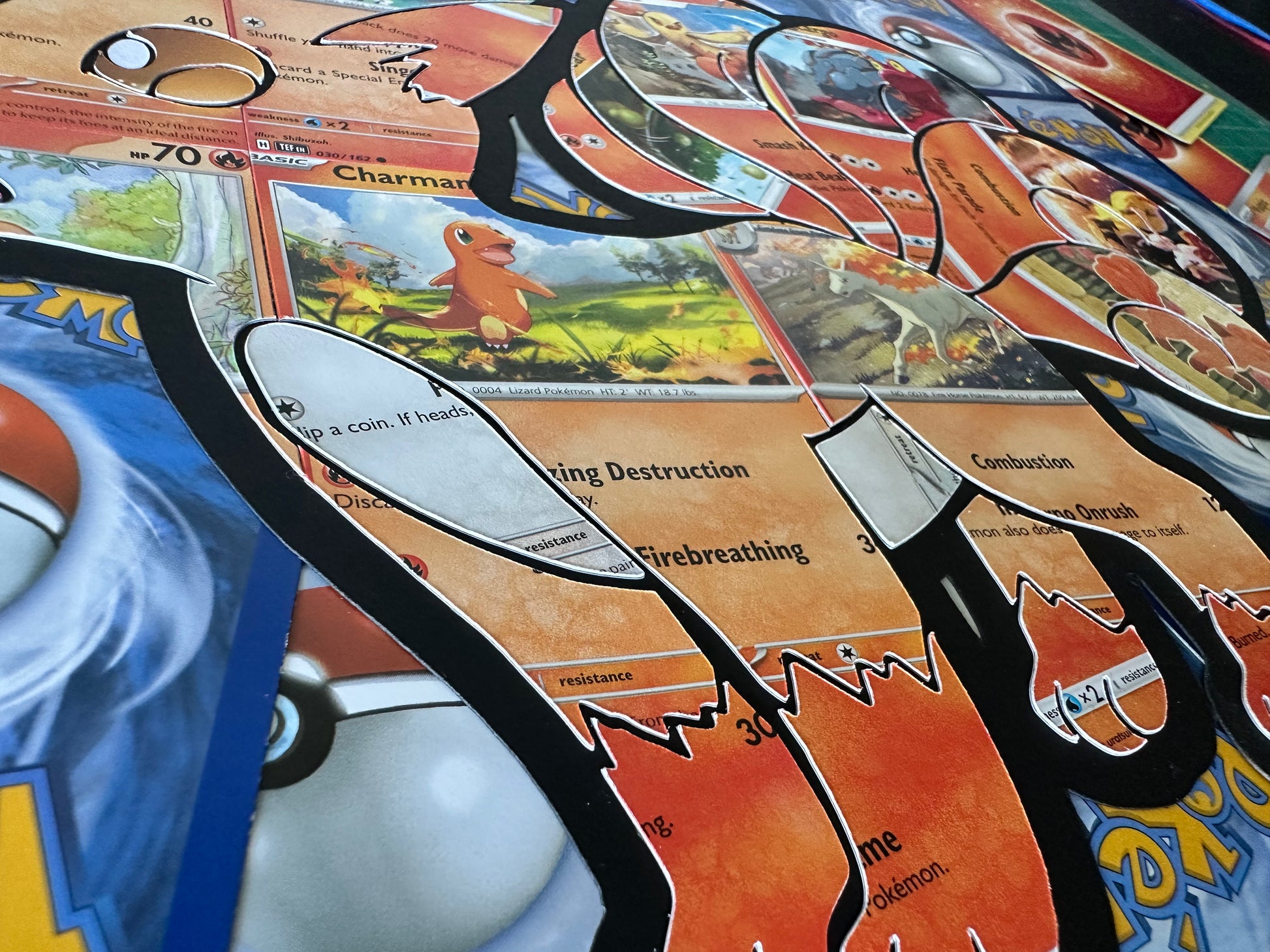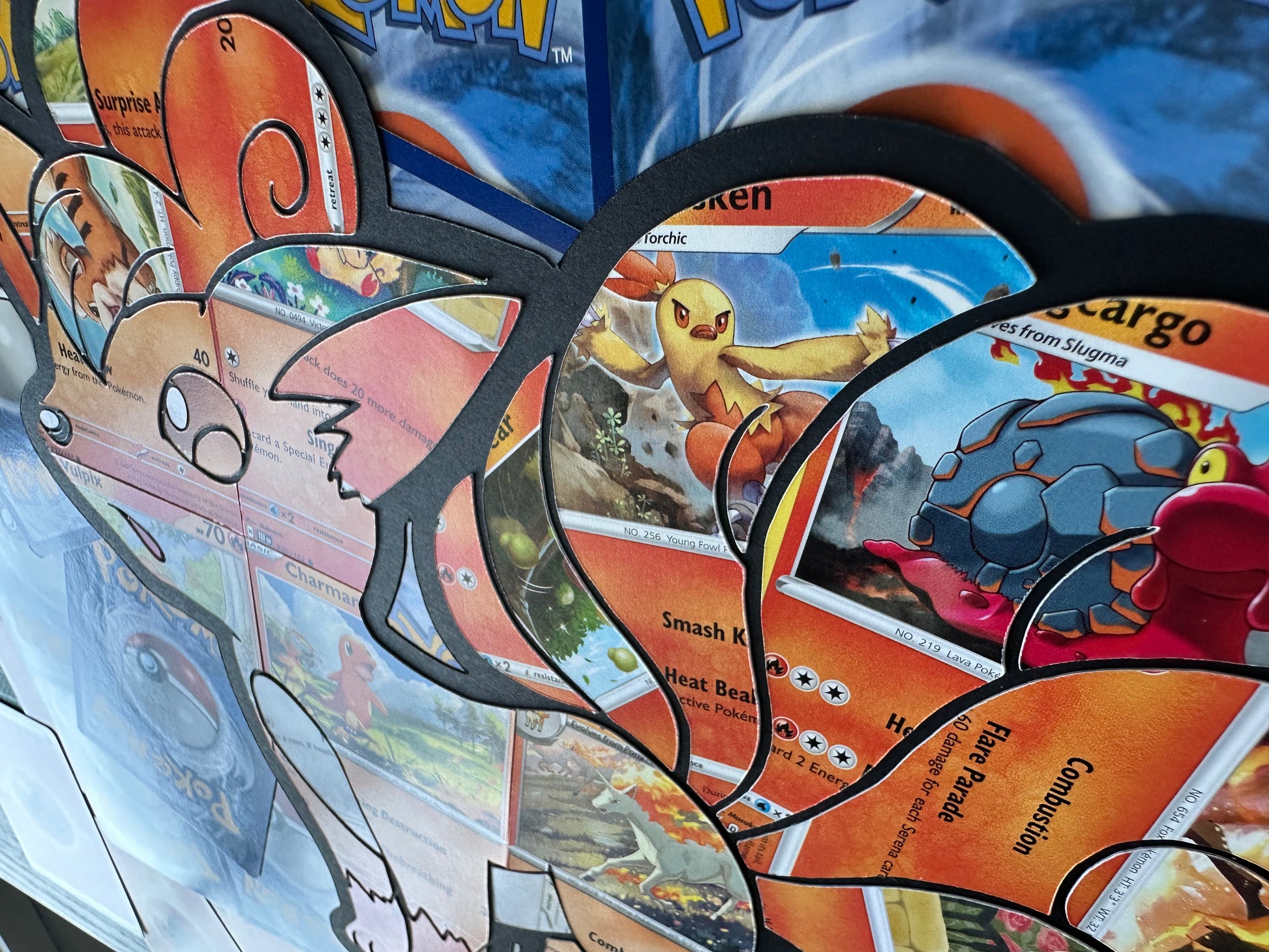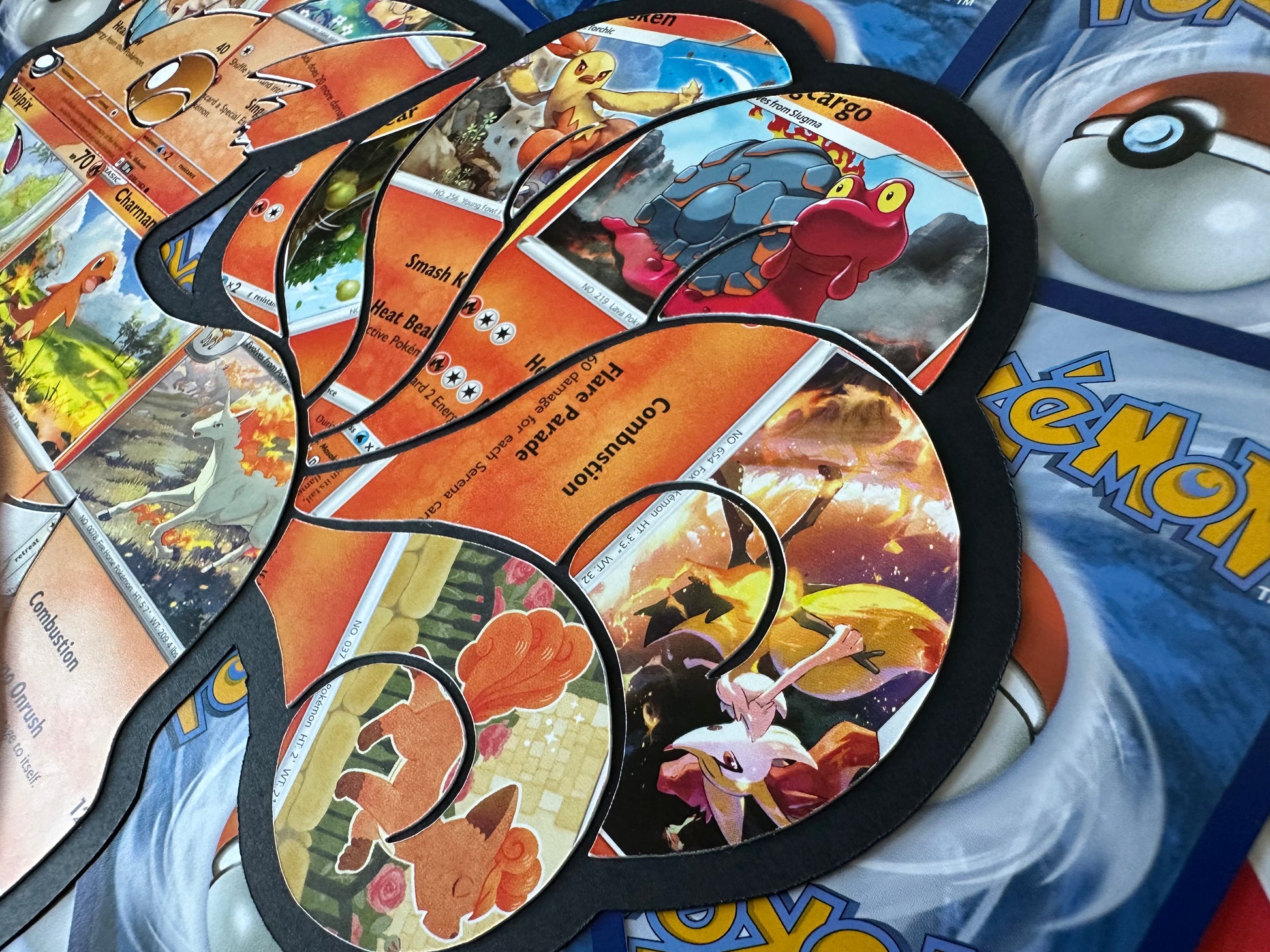 VULPIX has been carefully cut out from Pokémon cards and placed onto a background formed by an arrangement of card-backs.
