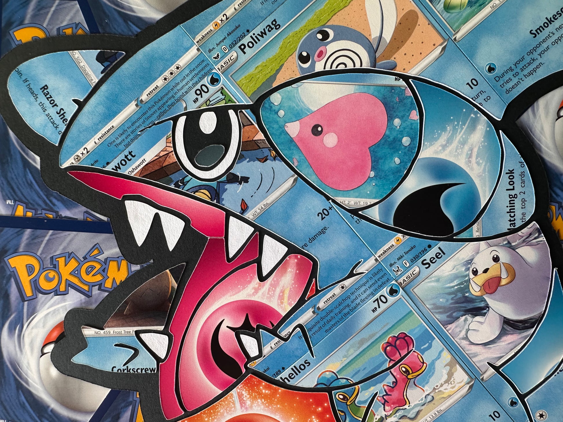 GIBLE has been carefully cut out from Pokémon cards and placed onto a background formed by an arrangement of card-backs.