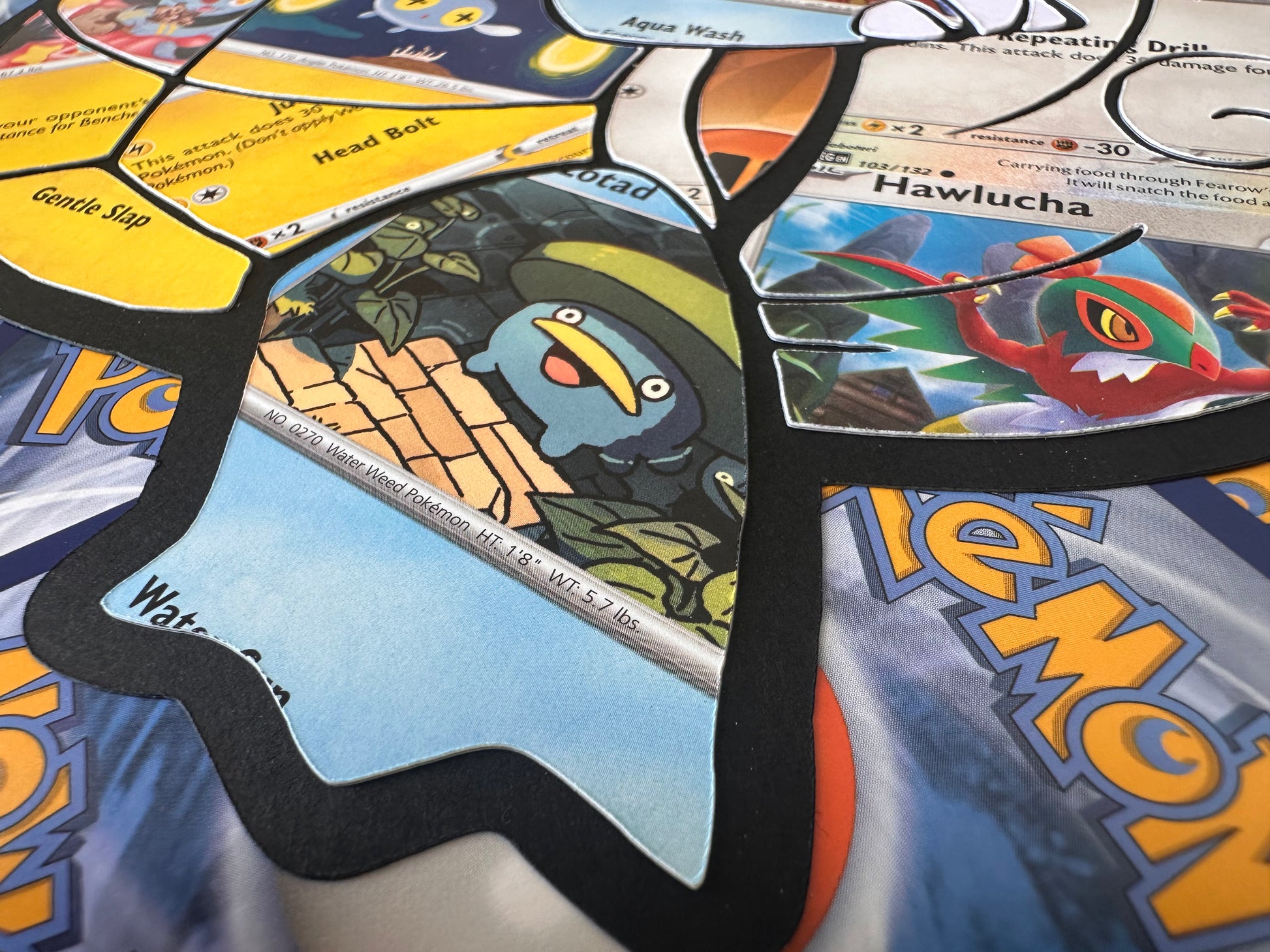 WARTORTLE has been carefully cut out from Pokémon cards and placed onto a background formed by an arrangement of card-backs.